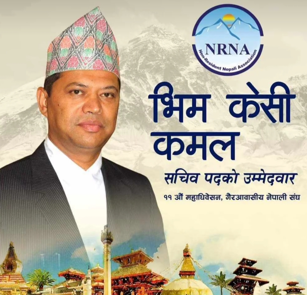 नेपाली बि स २०८० असोज ३० गते देखि कार्तिक २ गते अर्थात अक्टोबर १७-२० सम्म काठमाडौमा हुने NRNA ICC को ११ औ महाधिवेशन मा सचिब पदमा उम्मेदवारी दिदै भिम के सी कमल नेपाल आइ पुगेगेकाछन । विभिन्न मुलुकहरूमा प्रचार प्रसार कार्यक्रम सकेर नेपाल आइपुगेका छन ।