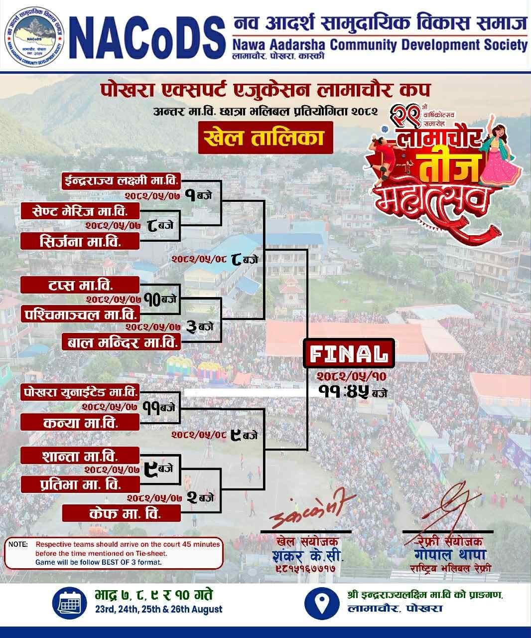 तीज मेलाको रौनकताको परिचय दिन सफल लामाचौर तीज मेलाको आरम्भ भएको छ । भाद्र ८,९ र १० गते तीज मेलाको तयारी पूरा भएको छ । मेलाको आकर्षणको रुपमा रहेको पोखरा एक्सपर्ट एजुकेसन लामाचौर कप बिध्यालय स्तरिय छात्रा भलिबल प्रतियोगिता भाद्र ७ गते शनिबारबाट आरम्भ भएको छ । प्रतियोगितामा भलिवलमा नाम चलेका पोखराका ११ वटा बिध्यालयले भाग लिएका छन ।