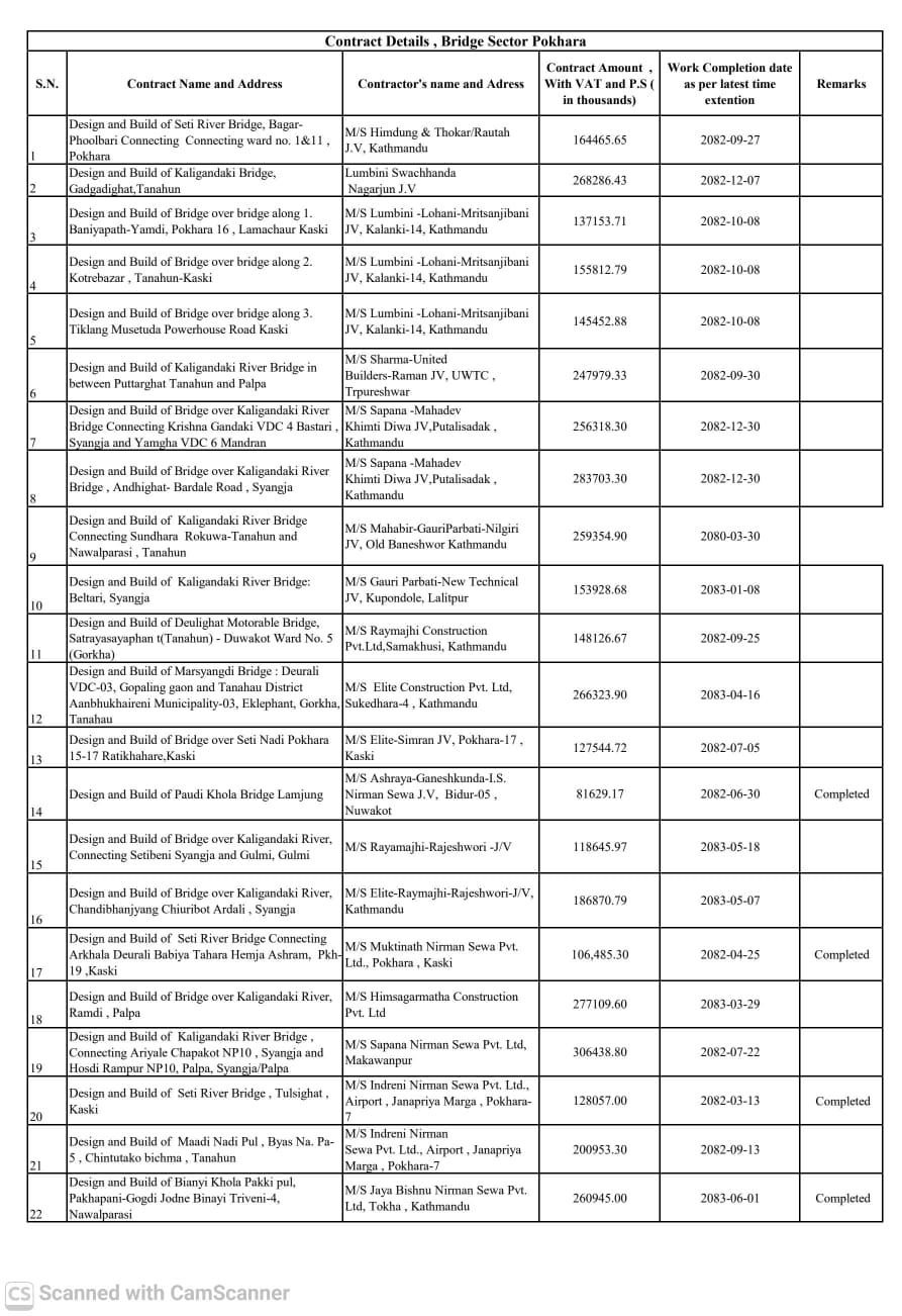 पुल सेक्टर पोखरा अन्तरगत २२ वटा पुल निर्माणका योजनाहरु सन्चालनमा रहेका छन । सन्चालनमा रहेका मध्य कतिपय योजना रुग्ण सुचिमा छन भने कतिपय कारबाही स्वरुप ठेक्का तोडिने अबस्थामा पुगेका छन । योजना हाता पार्ने तर बर्षौ सम्म योजना अलपत्र पारेर बिकासको बाधक बन्ने प्रवृत्तिका बिरुद्द सरकारले कडा कदम चाल्न सकेको छैन । यसो हुनुमा सरकर र ठेकेदार कम्पनी सन्चालकहरुको मिलेमतोको रुपमा लिइएको छ । के छ पोखरा सेक्टर अन्तरगत संचालित योजनाहरुको यथार्थ अबस्था , एक रिपोर्ट –