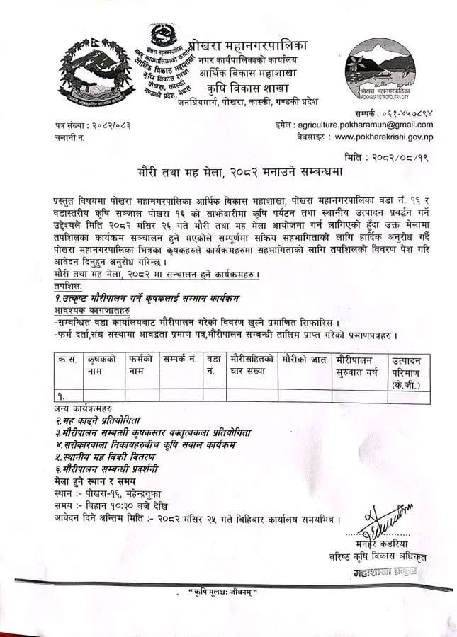 हो पोखराको महेन्द्र गुफामा यहि मङ्सिर २६ गते मौरी तथा मह महोत्सब हुने भएको छ । पोखरा महानगरपालिका आर्थिक बिकास महाशाखा समन्वय र पोखरा १६ नम्बर वडा स्तरिय कृषि सन्जालको आयोजनामा एक दिवसीय मह मेला हुने भएको हो । मौरी कृषकलाइ लक्षित गरि मेला आयोजना गर्न लागिएको वडा स्तरीय कृषि सन्जाल पोखरा १६ का अध्यक्ष जित बहादुर बस्नेतले बताए । महोत्सवमा पोखराका ३३ वटै वडाबाट मौरी पालक कृषकहरुको सहभागिता रहने बताइएको छ ।