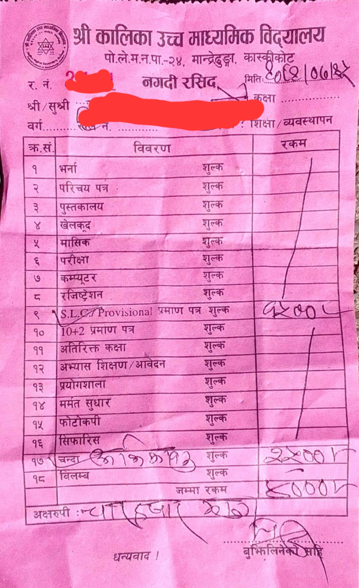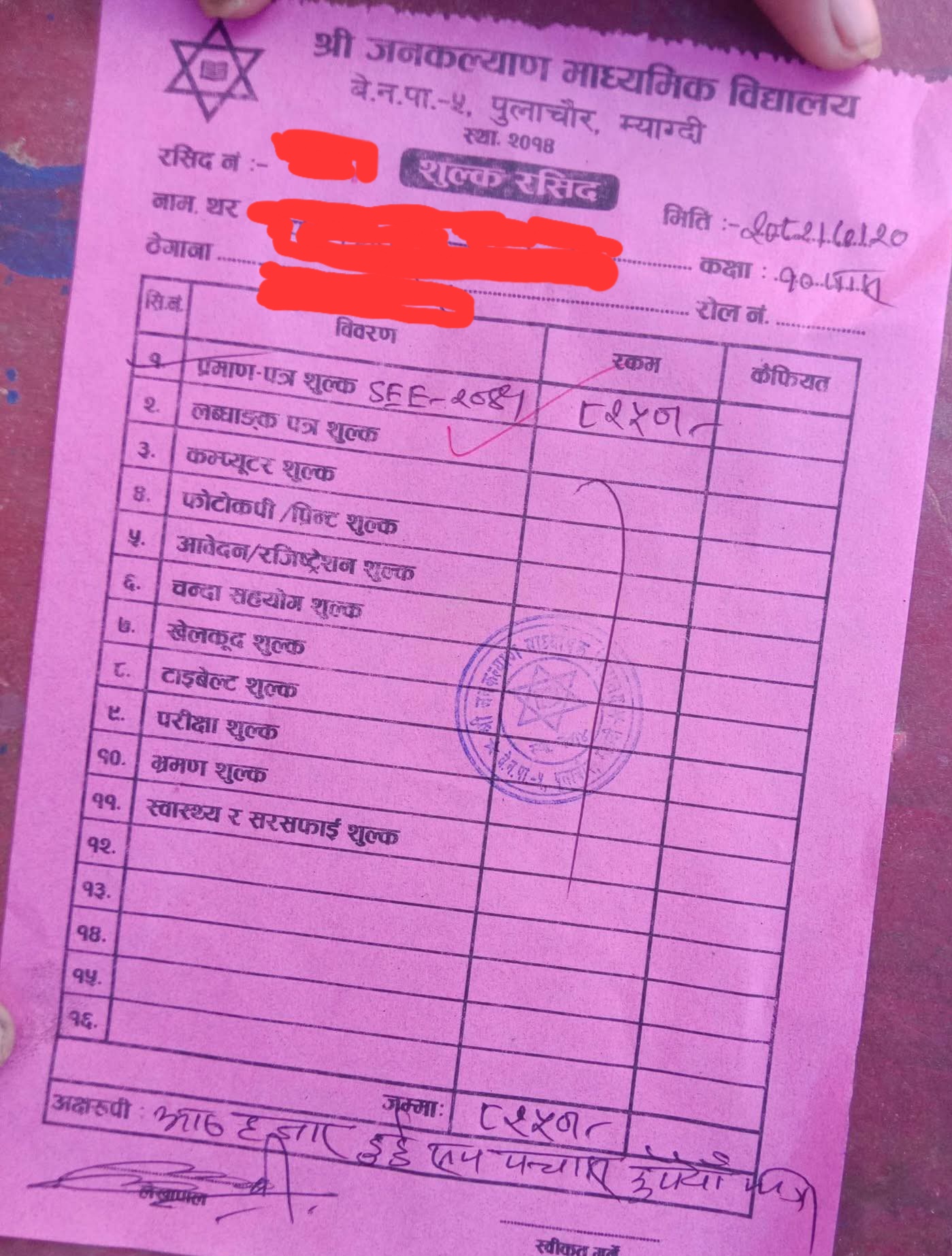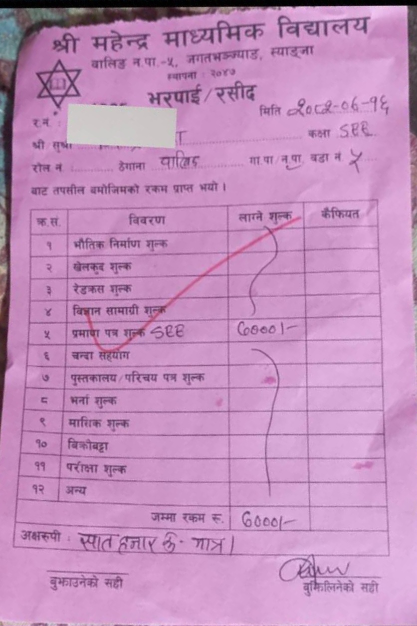 यस बिध्यालयले पनि एस इ इ प्रमाणपत्र बापत प्रती ब्यक्ती ७ हजार रुपैया असुल गरेको प्रमाणित भएको छ । २०८२ कार्तिक महिनामा काटेको बिलका अनुसार यस्तो अनियमित रकम मनोमानी ढङ्गबाट उठाएको पुष्टि गराएको हो । यो बर्ष महेन्द्र माविबाट २६ जनाले एस इ इ परीक्षा दिएका थिए । १-१२ कक्षा सम्म पढाइ हुने बिध्यालयमा १६० जना मात्र बिध्यार्थी रहेकाछन भने राहत र स्थायी गरेर १५ जना शिक्षक छन भने ४ जना निजिमा कार्यरत छन । यस बिषयमा बुझ्न खोज्दा नगर शिक्षा प्रमुख खेम ढकाल कार्यक्रममा ब्यस्त छु भन्दै बोल्न चाहेनन भने बिध्यालय ब्यबस्थापन समितिका अध्यक्ष समेत रहेका वडा नम्बर ५ का वडा अध्यक्ष छविलाल आलेले लिएको नगरपालिकाले दिएको मोबाइल सम्पर्क हुनै नसक्ने अबस्थामा राखिएको छ ।