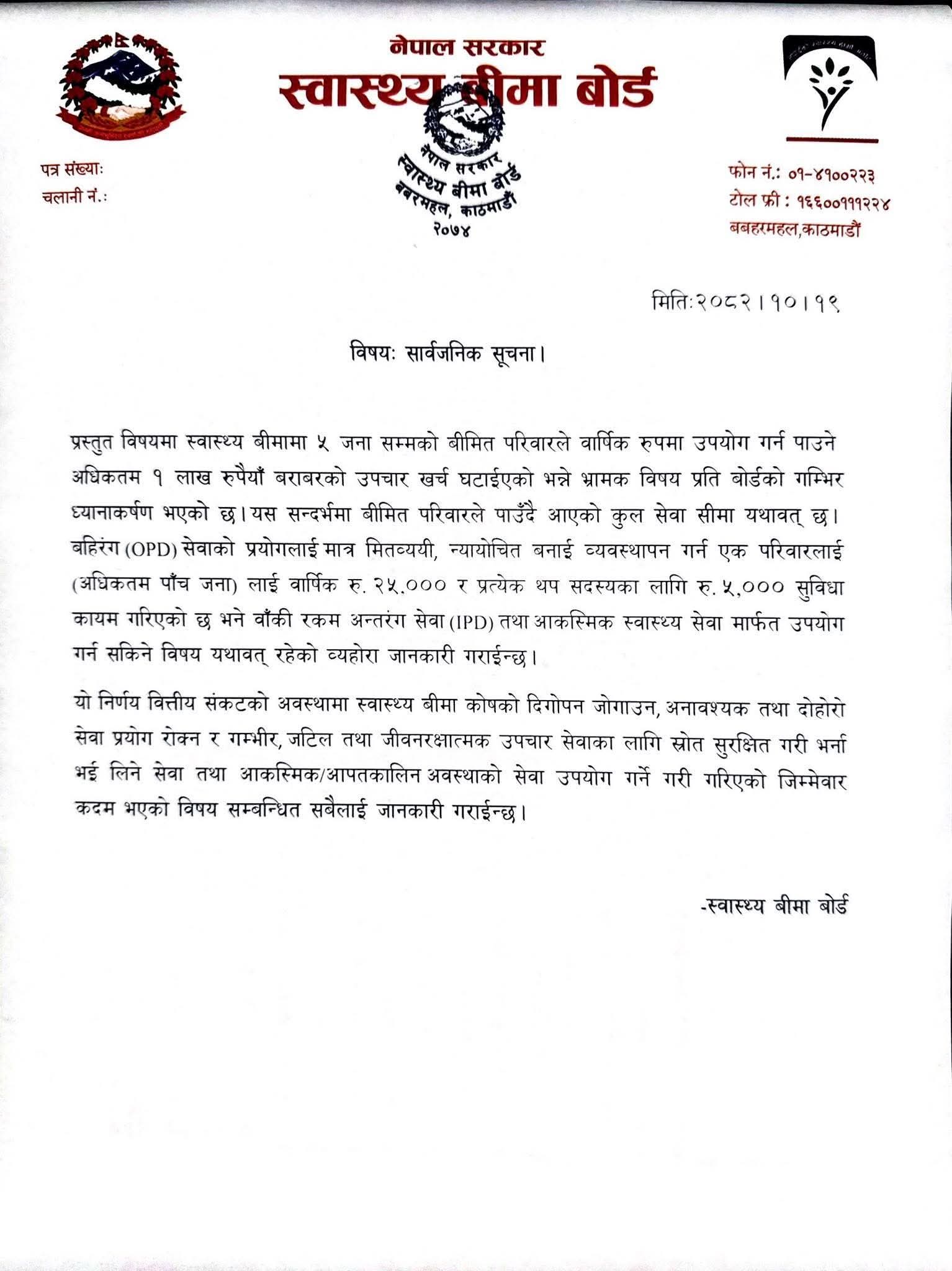 नागरिकले पाउदै आएको बिमाको औषधि उपचार सेवामा भारी कटौती गरेको आदेश गर्दै सर्बसाधारण नागरिकको ढाड सेक्ने काम गरेको छ । एक लाख रुपैयाको सुबिधा लाई बहिरङ्ग र अन्तरङ्ग भन्दै बिभाजन गरेको छ । अब नियमित औषधि खाने बिरामिले बर्ष भरिमा ५ हजार बराबरको औषधि खानेछन , त्यो भन्दा बढी औषधि किनेर खानुपर्ने बाध्यकारी बनाइएको छ । यसको अर्थ सिधै सेवा कटौती हो । सेवा र औषधिको यथार्थ मूल्य तोक्न नसक्ने सरकारी निकाय बिमा बोर्डले जनताको सेवा सुबिधा कटौतिमा कैँची लगाउनुले राज्य नागरिक प्रति कति अनुदार छ भन्ने पुष्टि गरेको छ ।