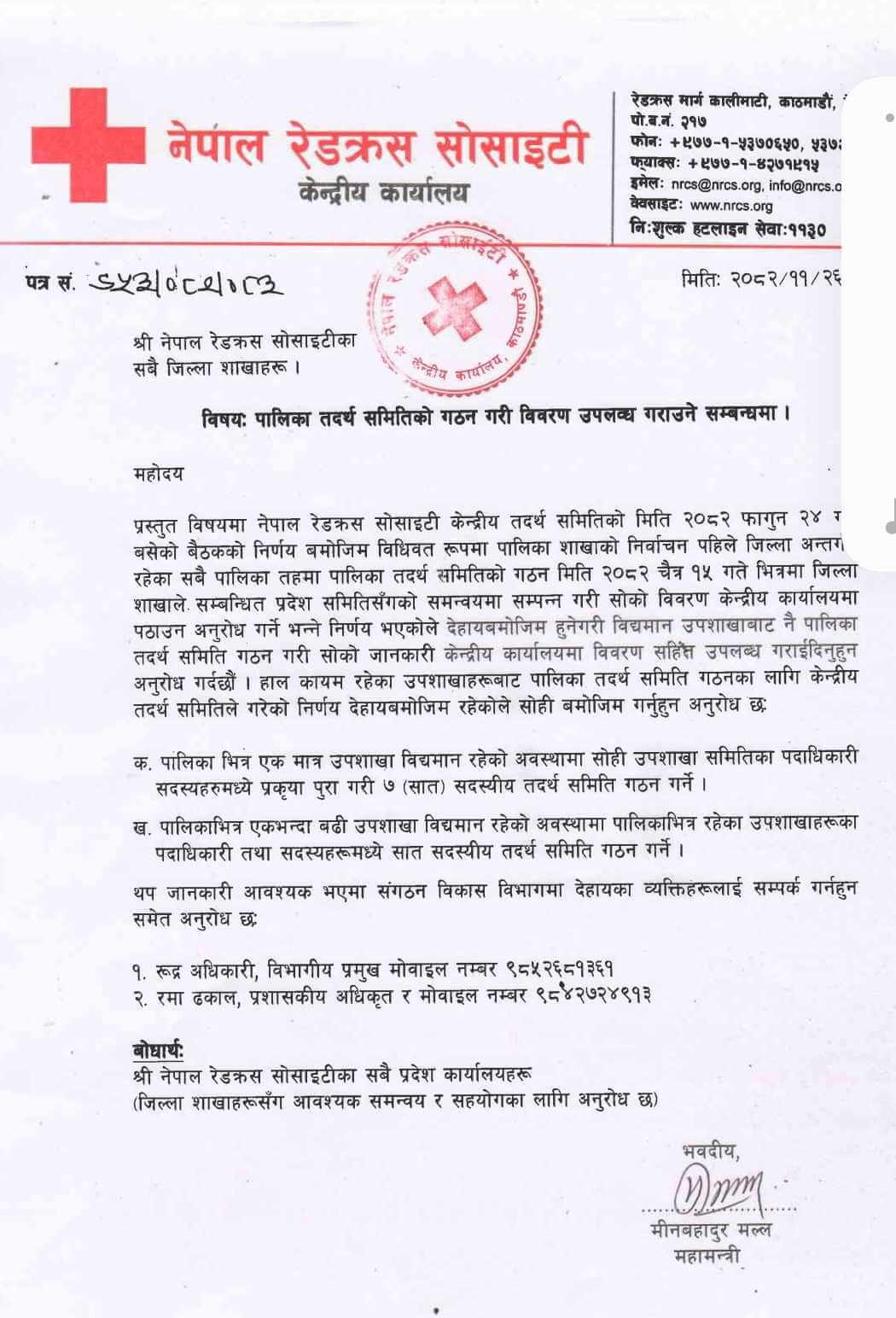 रेडक्रस जिल्ला शाखाले प्रदेश समिती सङ्ग आवश्यक समन्वय गरि प्रत्येक पालिकामा ७ सदस्यीय तदर्थ समिती गठन गरि केन्द्रमा विवरण पठाउनुपर्ने केन्द्रले निर्देशनात्मक सर्कुलर जारी गरेको छ । फागुन २४ गतेको निर्णयलाइ हवाला दिदै केन्द्रले फागुन २६ गते नेपालका सबै जिल्ला शाखाहरुलाइ पत्राचार गरेको हो । यो तदर्थ समितिले पालिकामा बिधिवत निर्वाचन गर्ने ससोधित बिधानमा ब्यबस्था गरिएको छ ।