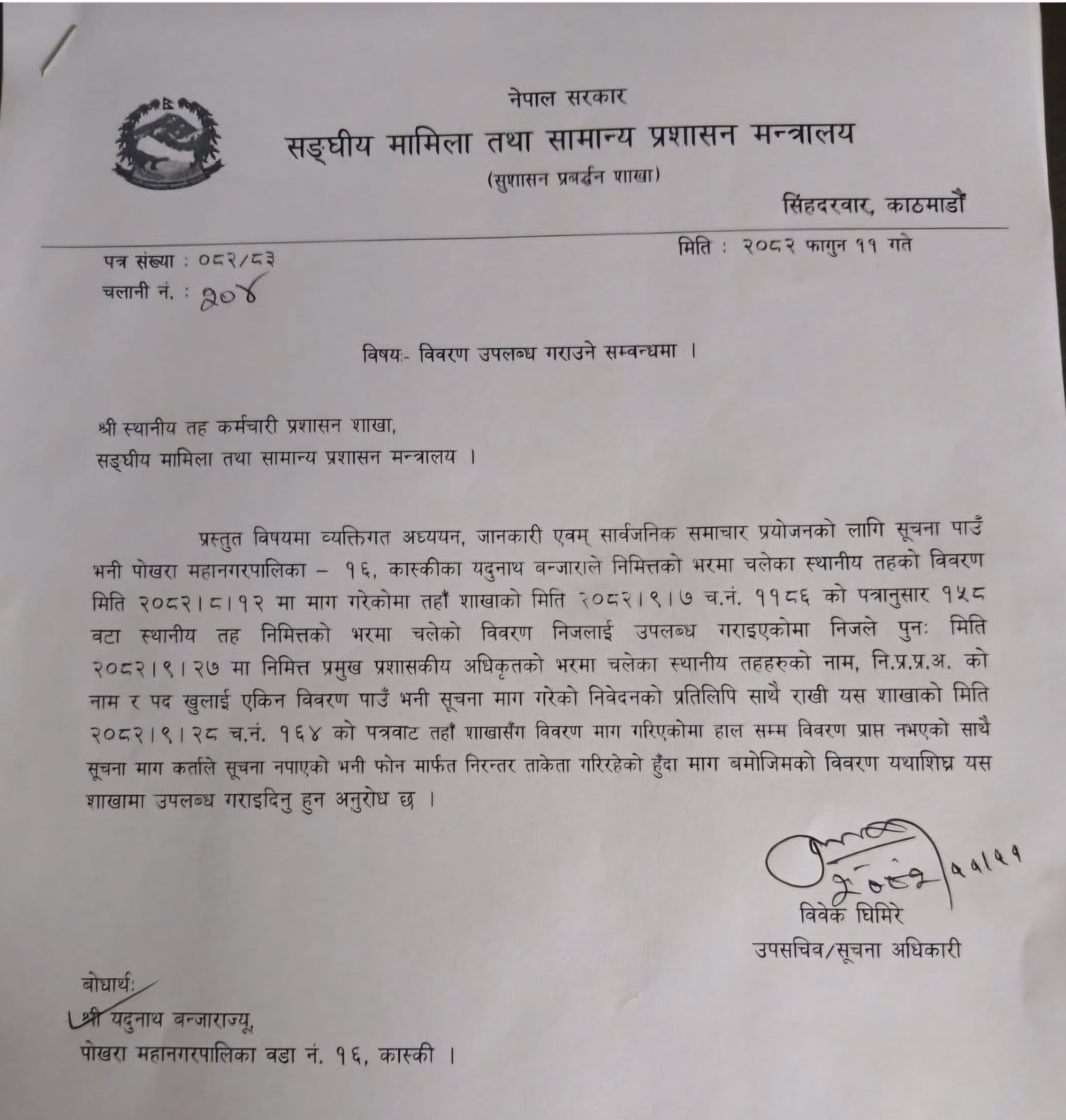 मन्त्रालयका सुचना अधिकारी बिबेक घिमिरेसङ्ग फोन मार्फत अनुरोध गरियो , उनले महाशाखामा माग गरिएको तर प्राप्त नभएको बताए, १० /१३ गते प्रमुखलाइ सम्बोधन गरि पठाइयो तर सुनुवाइ भएन । कप्र महाशाखा प्रमुख पार्वती शर्मा सङ्ग सम्बाद गरि सुचना पठाउन अनुरोध गरियो तर पनि प्राप्त भएन । पुन सचिब चन्द्रकला पौडेल लाई सम्बोधन गरि २०८२/११/०९ गते सुचना पाउन ताकेता निबेदन पठाइयो तर पनि सुनुवाइ भएन ।