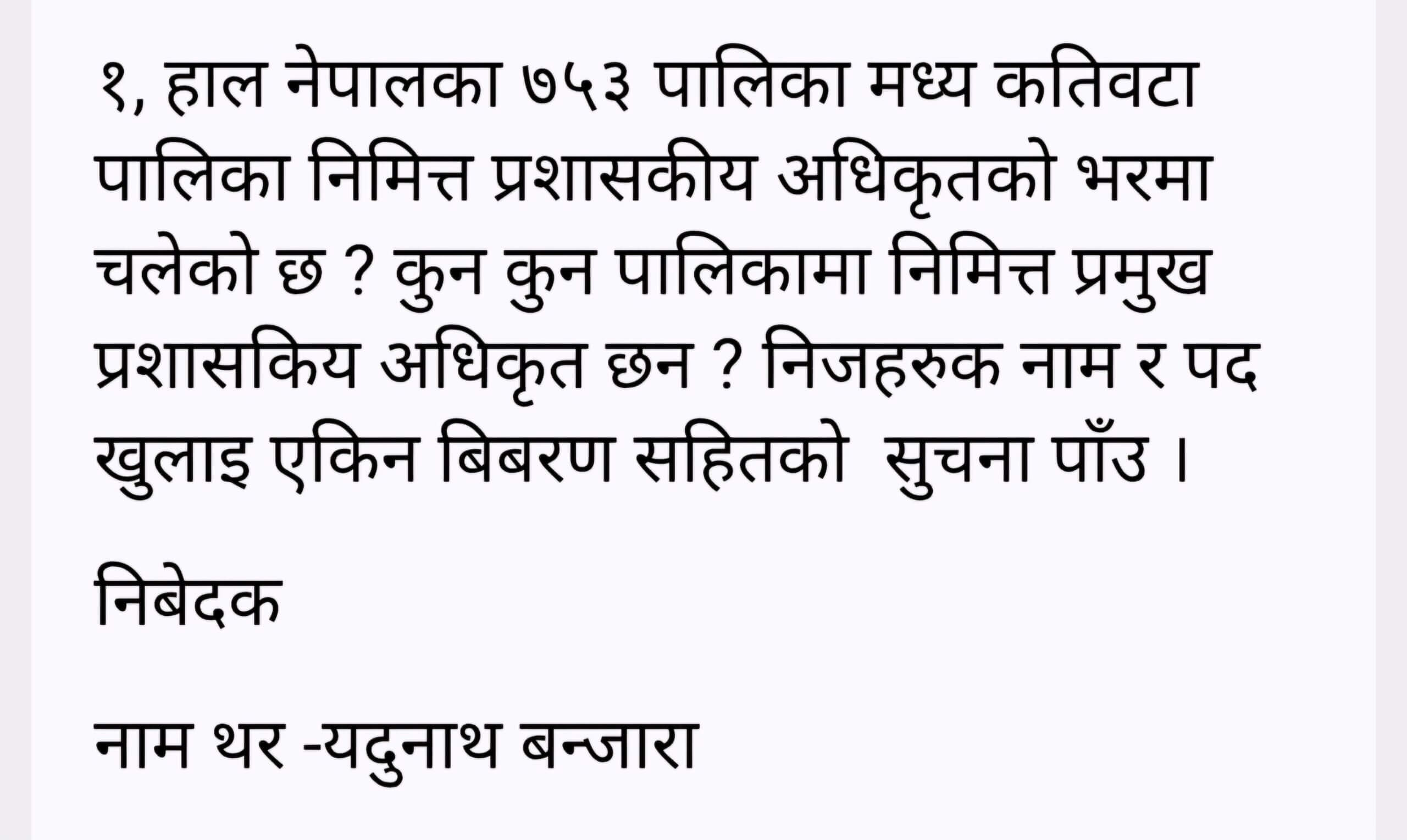 नागरिकको दैलोको सरकार भनेर चिनिने स्थानिय तहमा प्रमुख प्रशासकिय अधिकृत खटाउन समेत नसकेको आरोप र आलोचना खेपिरहेको मन्त्रालयसङ्ग नेपालका कति पालिकामा प्रमुख प्रशासकिय अधिकृत निमित्तको भरमा चलेका छन भनेर हामिले माग गरेको सुचना ४ महिना पूरा हुदा पनि उपलब्ध गराइएको छैन । २०८२ पुस २७ गते मन्त्रालयका सुचना अधिकारी सङ्ग “नेपालका कुन कुन पालिका निमित्तका भरमा चलेका छन ती पालिकाको नाम विवरण पाउ ” भन्ने एक बुदे सुचना माग गरिएको थियो तर आज यो समाचार लेख्दा सम्म सूचना उपलब्ध गराइएको छैन ।