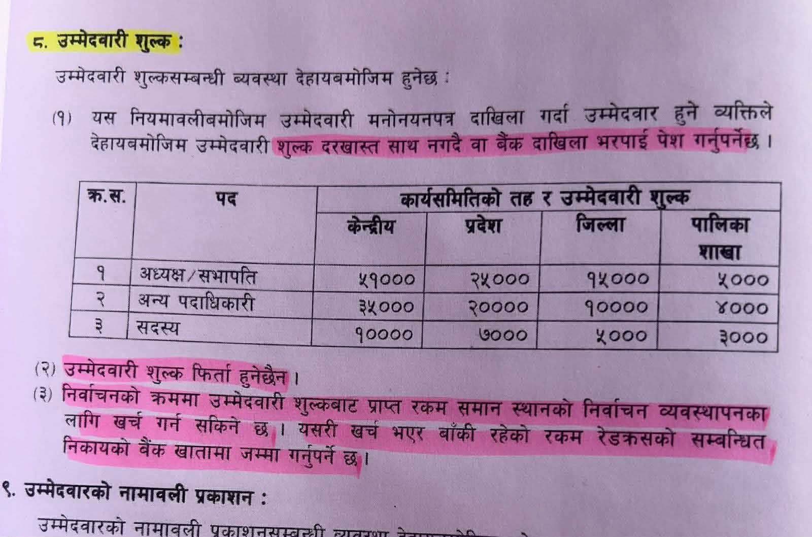 यस्तै निर्वाचनमा उम्मेदवारी दर्ता शुल्क अस्वभाविक ढङ्गबाट बृद्दी गरिएको छ । केन्दिय अध्यक्षमा उम्मेदवारी दिनेले ५० हजार रुपैयाँ उम्मेदवारी दर्ता शुल्क तिर्नुपर्नेछ । यस्तै केन्द्रिय पदाधिकारीले ३५ हजार रुपैयाँ शुल्क बुझाउनुपर्ने छ । प्रदेश अध्यक्षको लागि २५ हजार र पदाधिकारिको लागि २० हजार शुल्क तोकिएको छ । जिल्ला अध्यक्षको लागि १० हजार र पदाधिकारीको लागि ७ हजार तोकिएको छ यस्तै पालिका अध्यक्षमा ५ हजार , पदाधिकारीको ४ हजार र सदस्यको लागि ३ हजार रुपैया शुल्क तिर्नुपर्ने भएको छ उक्त रकम फिर्ता हुने छैन ।