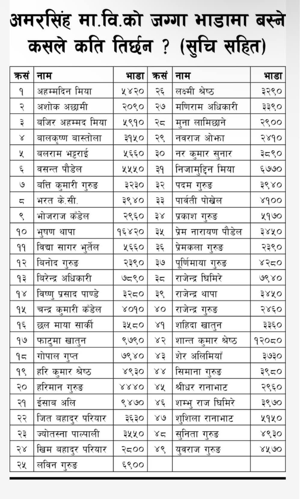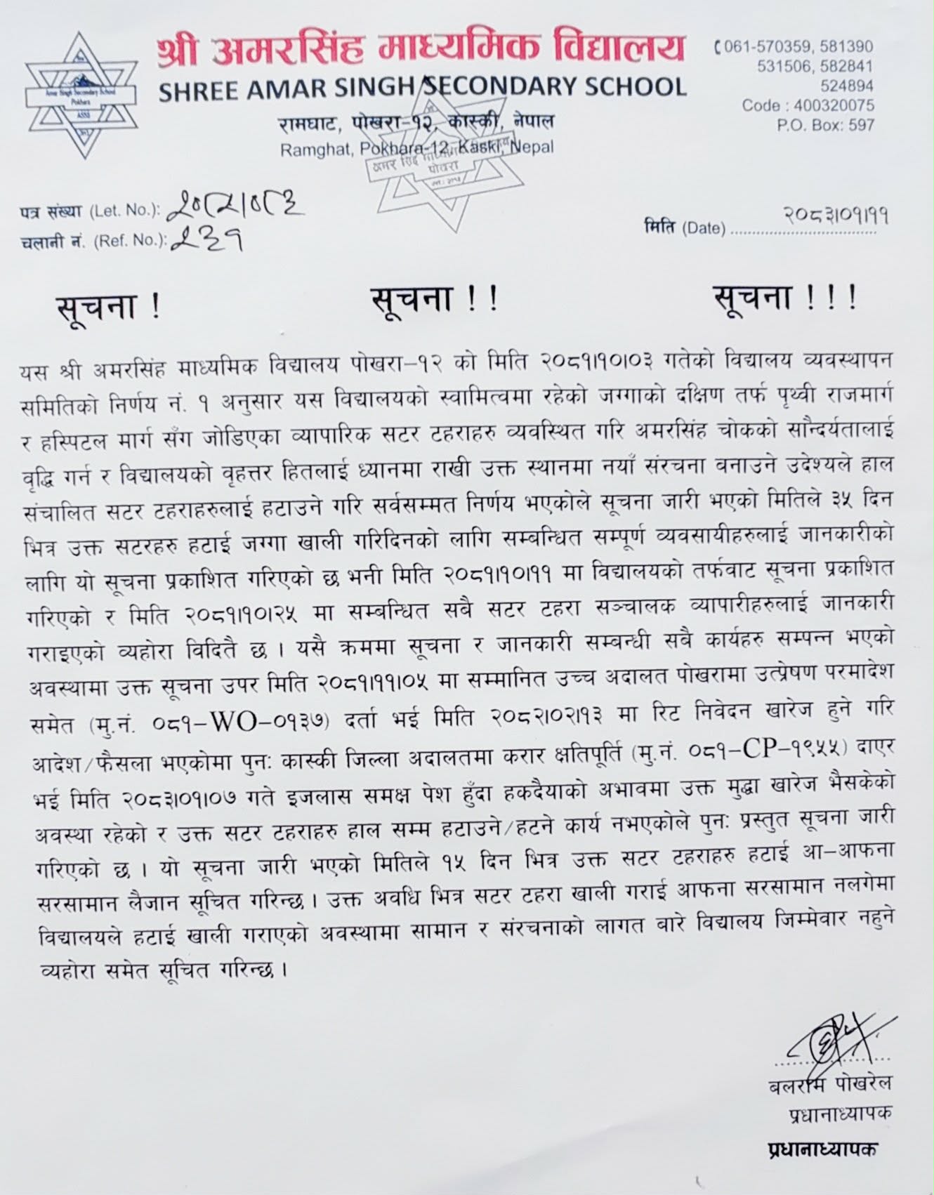 अमरसिंह माध्यमिक विद्यालय, पोखरा–१२ ले आफ्नो स्वामित्वमा रहेको जग्गामा सञ्चालन हुँदै आएका व्यापारिक सटर टहरा हटाउन पुनः सूचना जारी गरेको छ। विद्यालयको निर्णयअनुसार उक्त क्षेत्रलाई व्यवस्थित गर्दै नयाँ संरचना निर्माण गर्ने योजना अघि बढाइएपछि हाल सञ्चालनमा रहेका सटर हटाउन लागिएको हो। बिध्यालयले १५ दिनभित्र सटर खाली गर्न ब्यापारीका नाममा सार्बजनिक सुचना प्रकाशन गरेकोछ ।